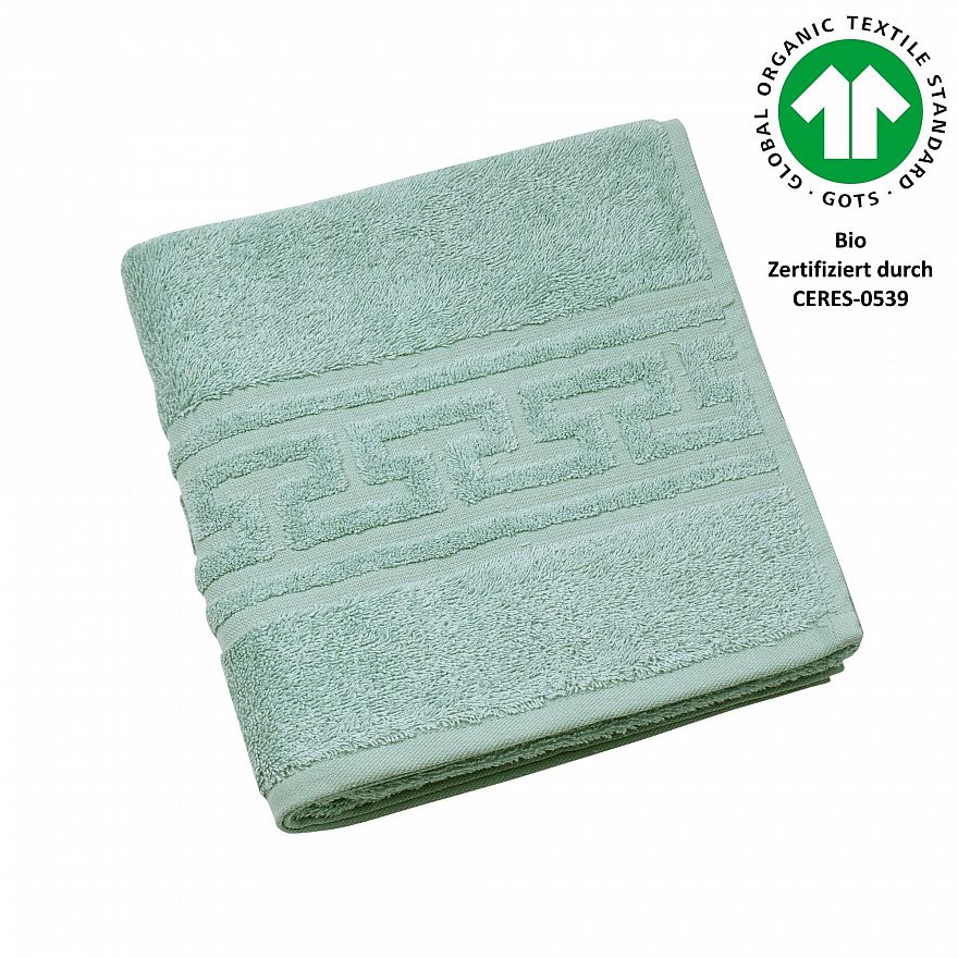 Luxus-Qualität, 520 g/m², 100% Baumwolle aus kontrolliert biologischem Anbau, Jacquard-Bordüre „Mäander“, trocknerbeständig, verzieht nicht nach dem Waschen, 60° waschbar, GOTS zertifiziert