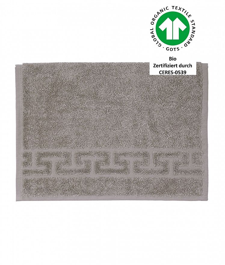 Luxus-Qualität, 520 g/m², 100% Baumwolle aus kontrolliert biologischem Anbau, Jacquard-Bordüre „Mäander“, trocknerbeständig, verzieht nicht nach dem Waschen, 60° waschbar, GOTS zertifiziert