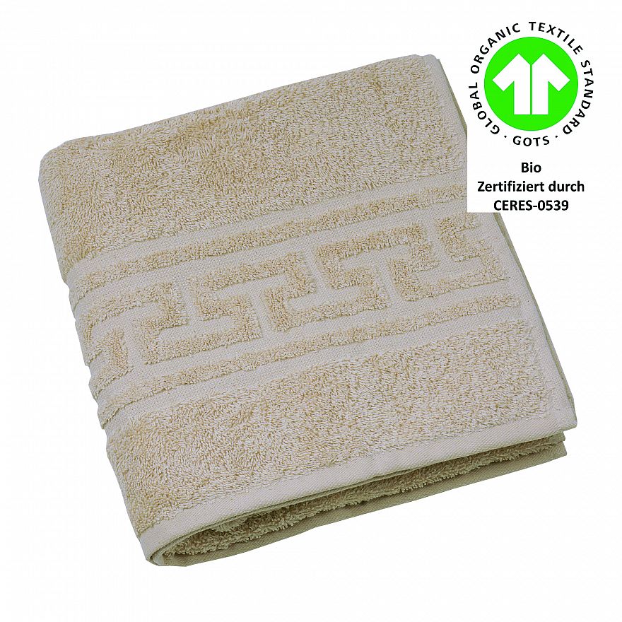 Luxus-Qualität, 520 g/m², 100% Baumwolle aus kontrolliert biologischem Anbau, Jacquard-Bordüre „Mäander“, trocknerbeständig, verzieht nicht nach dem Waschen, 60° waschbar, GOTS zertifiziert