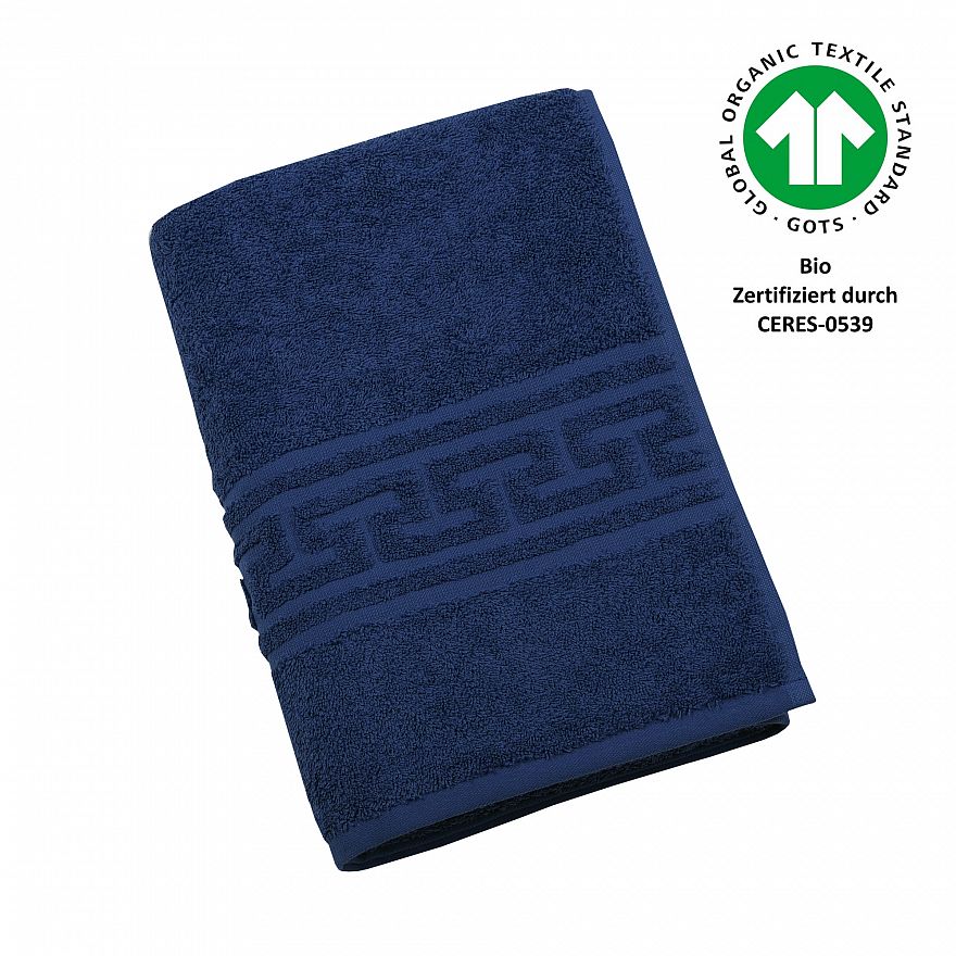 Luxus-Qualität, 520 g/m², 100% Baumwolle aus kontrolliert biologischem Anbau, Jacquard-Bordüre „Mäander“, trocknerbeständig, verzieht nicht nach dem Waschen, 60° waschbar, GOTS zertifiziert