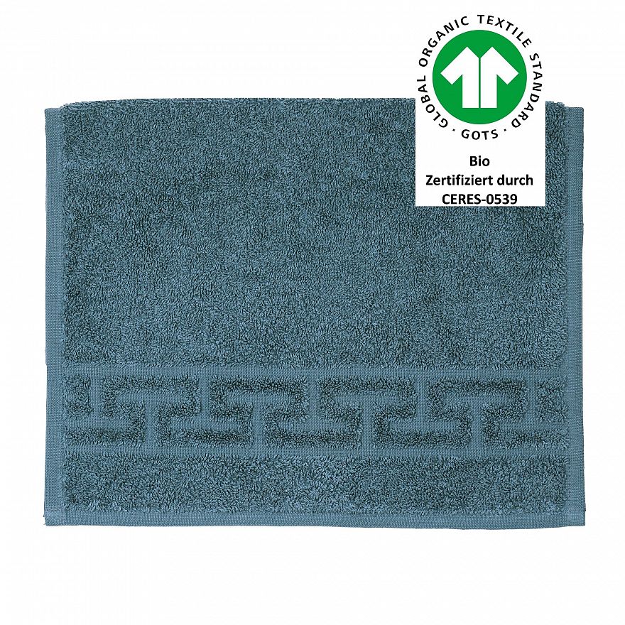 Luxus-Qualität, 520 g/m², 100% Baumwolle aus kontrolliert biologischem Anbau, Jacquard-Bordüre „Mäander“, trocknerbeständig, verzieht nicht nach dem Waschen, 60° waschbar, GOTS zertifiziert