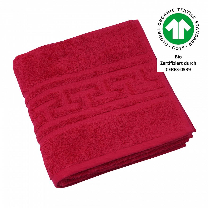 Luxus-Qualität, 520 g/m², 100% Baumwolle aus kontrolliert biologischem Anbau, Jacquard-Bordüre „Mäander“, trocknerbeständig, verzieht nicht nach dem Waschen, 60° waschbar, GOTS zertifiziert