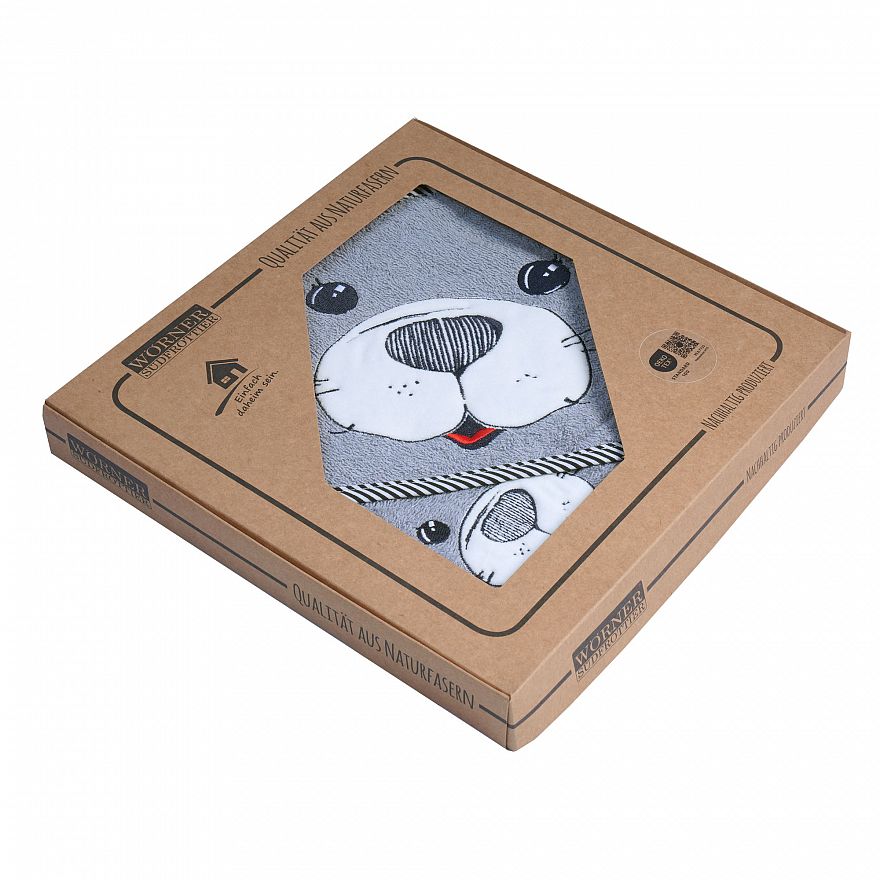 Geschenk-Karton, bestehend aus Kapuzen-Badetuch mit Stickerei 80 x 80 cm (---91) und Waschhandschuh mit Stickerei (---90) Aufmachung: Geschenk-Karton Versandeinheit: 1 Stück Öko-Tex Standard 100