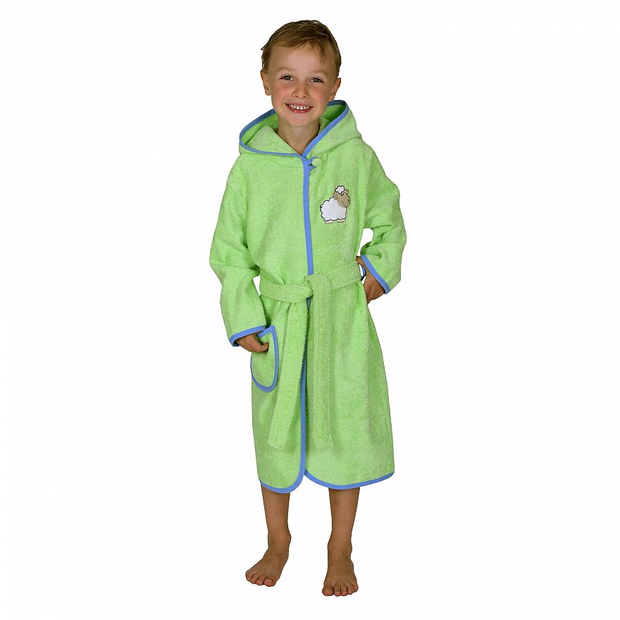 Kinder-Bademantel mit Kapuze, Tasche, Knopf am Hals und Gürtel. Aus flauschiger Frottierware mit Stickerei.